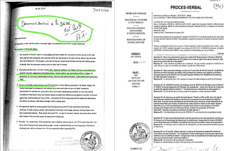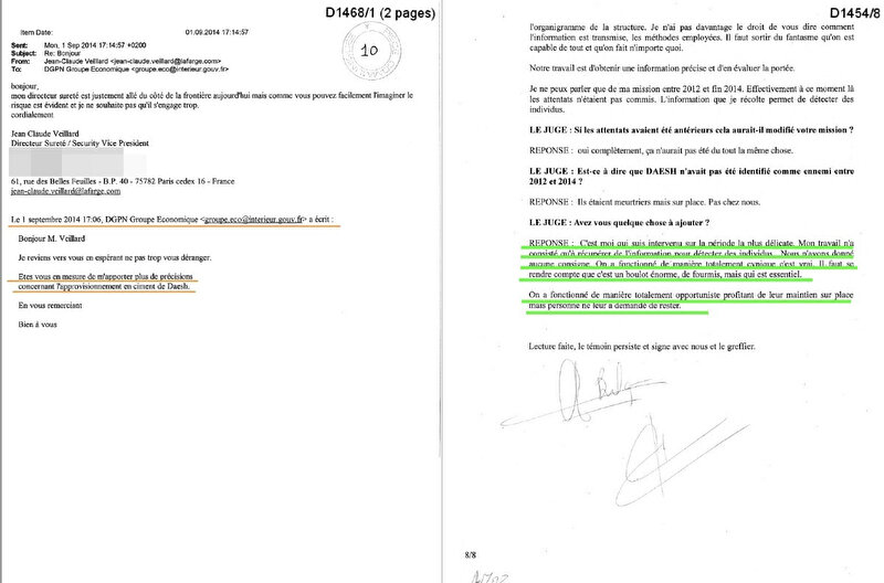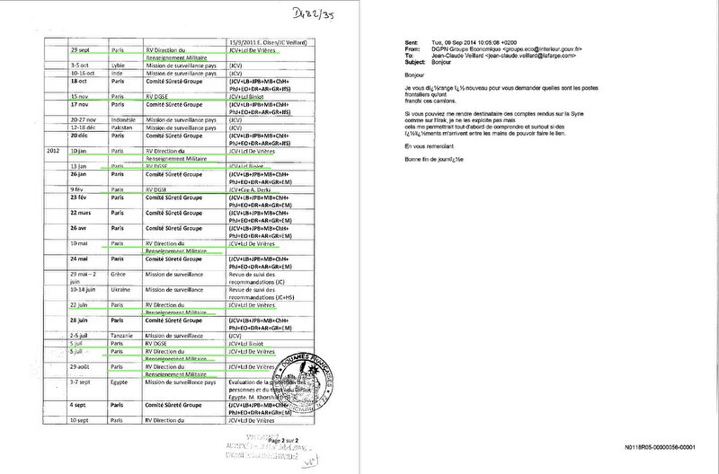Fransız devletine ait belgelerde Lafarge şirketi ile Fransız istihbarat servisi arasındaki ilişkinin 22 Ocak 2014'te şirketin güvenlik müdürü Jean Claude Veillard'ın İçişleri Bakanlığı istihbaratına ait bir adrese gönderdiği e-postayla başladığı anlaşılıyor.