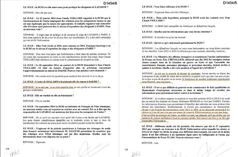 İfade tutanağına göre görevli, Lafarge’ın Suriye’deki bilgi kaynakları olduğunu kabul etti. İstihbaratçı, hakime Fransız gizli servislerinin Lafarge fabrikasından nasıl faydalandıklarını anlattı. Tutanaklarda istihbaratçı, 2012-2014 döneminde Lafarge tarafından Suriye’deki tüm silahlı gruplara çimento gönderildiğini söyleyerek DEAŞ’ı bunun dışında tutmadı.