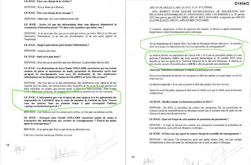Lafarge'a yanıt veren istihbarat servisi görevlisi bu durumu görüşecekleri bir tarihi kendisine bildirdi. Lafarge-terör örgütü ilişkilerinin skandal olarak Fransa gündemine gelmesi ve konunun mahkemeye yansımasının ardından 18 Kasım 2018’de AM 02 kod isimli istihbarat mensubu, mahkemede ifade verdi.