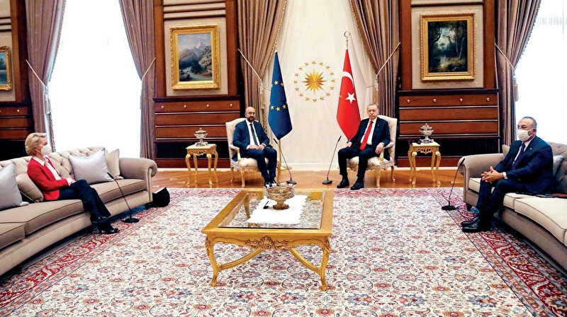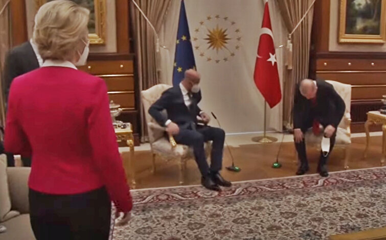 AB Konseyi Başkanı Michel'in Cumhurbaşkanlığı Külliyesi'ndeki görüşmede, Cumhurbaşkanı Erdoğan ile yan yana sandalyelerde oturması, AB Komisyonu Başkanı Ursula von der Leyen'in ise daha uzakta bir koltukta oturması ziyaretten bu yana Avrupa basınına konu oluyor.