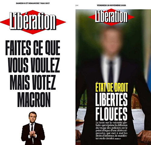 2017’de "Ne yaparsanız yapın ama Macron'a oy verin" başlığı atan Fransız Liberation gazetesi, son sayısında Macron hükümetinin baskıcı tutumunun ne boyutlara ulaştığını gözler önüne serdi. "Hukuk devleti: Hürriyetler karartılıyor" ifadesini kullanan Liberation, Fransa'da güvenlik güçlerinin görüntülenmesinin yasaklanmasının ‘baskıcı bir sürüklenmenin doruk noktası’ olduğunu yazdı.