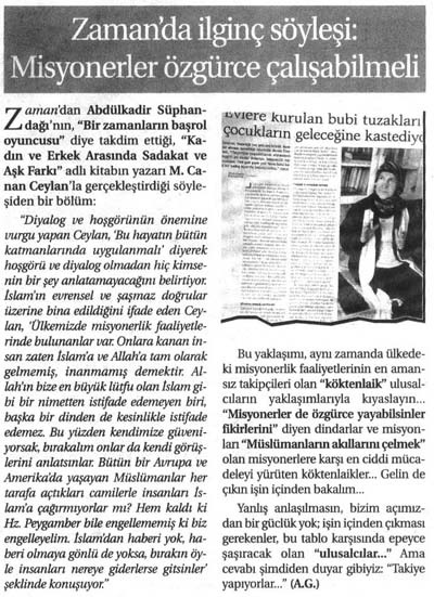 Zaman Gazetesi, 'Kadın ve Erkek Arasında Sadakat ve Aşk Farkı' adlı kitabın yazarı M. Canan Ceylan ile dikkatleri çeken bir söyleşi yaptı. Gazetede büyük yer bulan söyleşinin bir bölümünde misyonerlik vurgusu yapıldığı net bir şekilde görülüyor. Ceylan, "Ülkemizde misyonerlik faaliyetlerinde bulunanlar var. Onlara kanan insan zaten İslam'a ve Allah'a tam olarak gelmemiş, inanmamış demektir... Bu yüzden kendimize güveniyorsak, bırakalım onlar da kendi görüşlerini anlatsınlar" diyor.