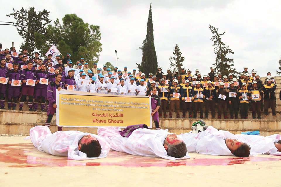 Suriye’nin İdlib kentindeki Beyaz Baretliler gönüllüleri, Doğu Guta’daki yoğun rejim saldırı altında bulunan sivil savunma gönüllülerine destek vermek için bir araya geldi. Guta’da hayatını kaybeden gönüllülerin fotoğraflarını taşıyan Beyaz Baretliler, “Doğu Guta’da sivil savunma ekiplerine yönelik saldırılara karşıyız” yazılı pankart açtı.