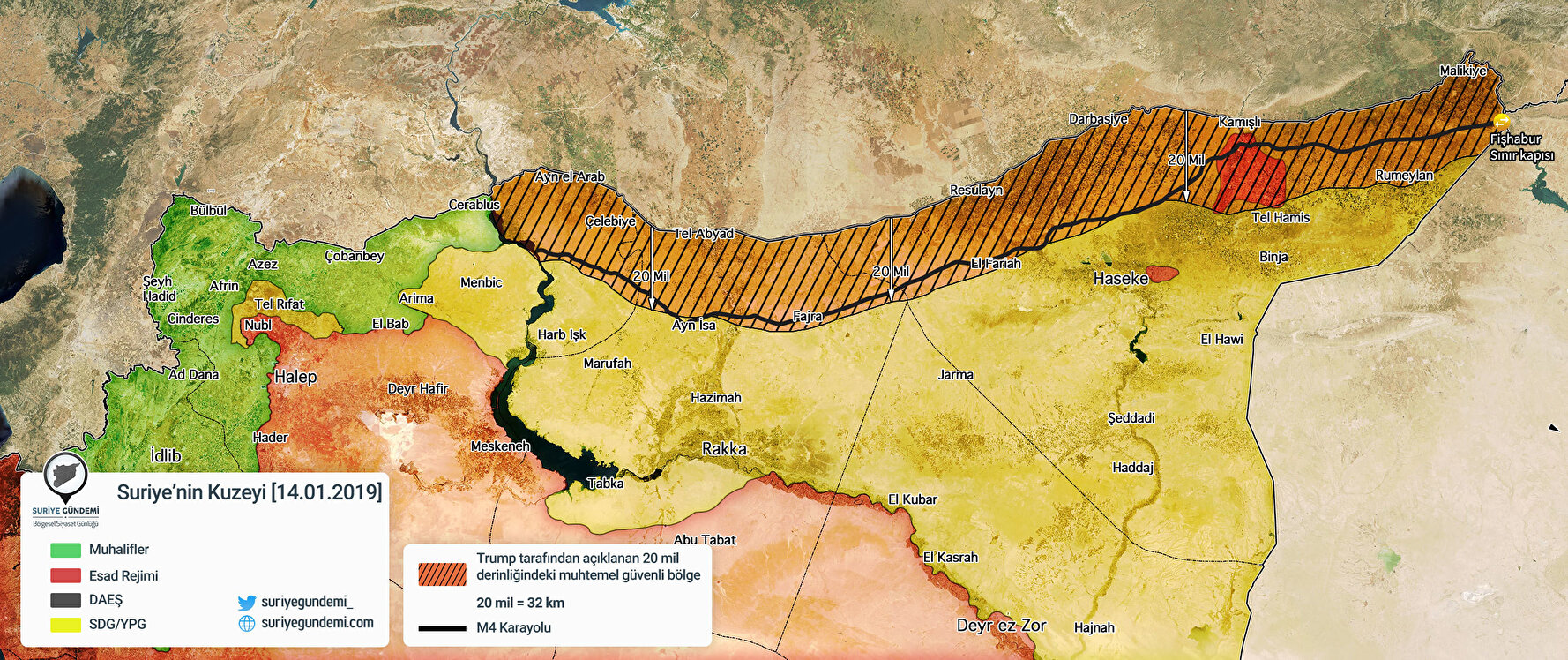 ABD Başkanı Trump'ın gündeme getirdiği ve Türkiye'nin ilk etapta olumlu baktığı güvenli bölge planı, Suriye-Türkiye sınırı boyunca 460 kilometrelik bir hattı içeriyor. Fırat nehrinin doğusundaki hat, batıda Sacur çayından, doğuda Haseke'nin Malikiyye ilçesine uzanıyor. 20 mil (32 kilometre) derinlikte, idari olarak Aynularab ve Tel Abyad da dahil olmak üzere Rakka ve Haseke'nin 8 ilçesi yer alıyor. Münbiç ilçe merkezi, 32 kilometrenin dışında kalıyor.