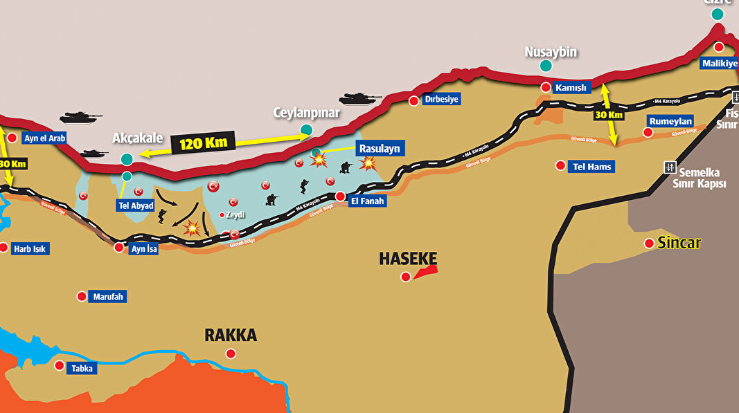 - Takip eden saatlerde Rasulayn’a 55 araçlık bir konvoy daha giriş yaptı. İlçede 125 araca ulaşan aynı konvoy yine Tel Tamir istikametinde bölgeden ayrıldı. Ambulans ve sivil araçlar, yaralı teröristleri, Türkiye’nin harekât bölgesinde açtığı koridordan çıkartarak önce Tel Tamir’e, oradan da Haseke ilinin Kamışlı ilçesine götürdü. Araç camlarının film ya da gazeteyle kapatılmış olması dikkat çekti. Türkiye, ABD’yle olan mutabakat çerçevesinde teröristlerin harekât bölgesini terk etmelerine izin verdi.