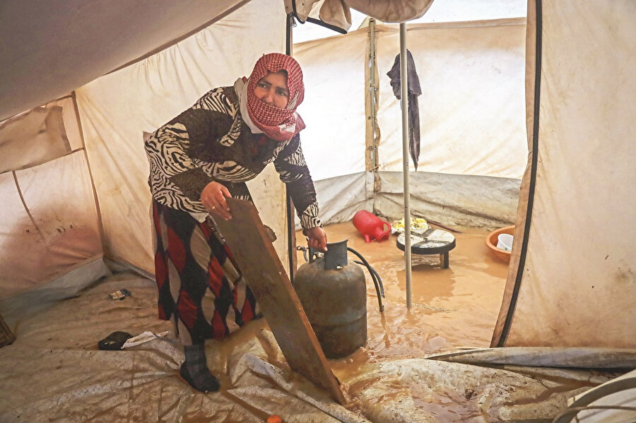 - 5 çocuk annesi Nisrin Kaddour da çadırın içine giren yağmur suyu yüzünden çadırı ailesiyle terk etmek zorunda kaldığını söyledi. Kaddour, “Tüm eşyalarımız sular altında kaldı, elbisemiz kalmadı. Altında ısınacağımız battaniyemiz yok, çocuklarım hastalandı” dedi. Gidecek yerleri olmadığını vurgulayan Kaddour, “yardım” çağrısında bulundu.