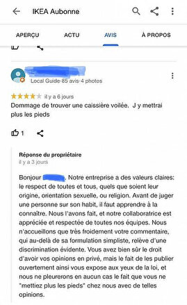 Bunun üzerine IKEA mağazasının sosyal medya sorumlusu, müşterinin yorumuna yazdığı cevapta, "Şirketimizin değerleri açıktır: Kökeni, dini veya cinsel yönelimi ne olursa olsun herkese saygı ile yaklaşıyoruz. Bir insanı kıyafeti üzerinden yargılamadan önce onu tanımalısınız. Biz ön yargılı davranmadık ve bahsettiğiniz çalışanımız herkes tarafından sevilen ve sayılan biri. Bu yüzden sizin açıkça ayrımcılık yapan yorumunuzu hoş karşılamıyoruz. Böyle fikirlere sahip birinin de mağazamıza gelmemesine üzülmüyoruz" ifadelerini kullandı.