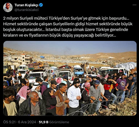 Gazeteci Turan Kışlakçı iki milyon Suriyeli mültecinin Türkiye’den Suriye’ye gitmek için başvurduğunu belirtti. Sosyal medya hesabından açıklama yapan Kışlakçı "