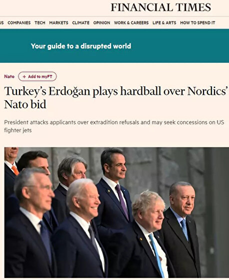 - Londra merkezli Financial Times gazetesi, Başkan Erdoğan'ın NATO'ya yeni üyelikleri engelleme yönündeki açıklamalarının ciddiye alınması gerektiğini yazdı. "Erdoğan, Nordik ülkelerinin NATO üyelikleri konusunda şaka yapmıyor" başlıklı haberde, Türiye'nin, İsveçli yetkililerin, terör örgütününüst düzey isimleriyle görüşmelerine kızgın olduğu aktarıldı.