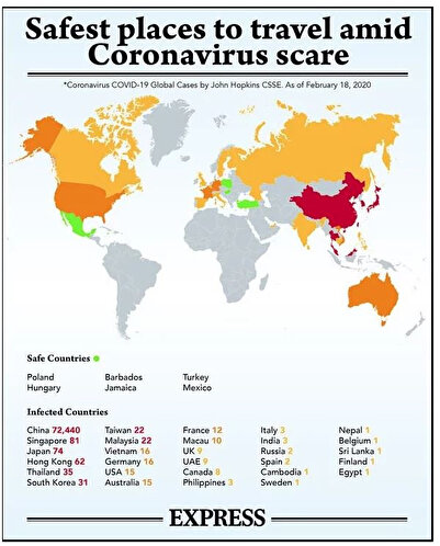 Haberde yayınlanan haritada, kısa uçuşlu tatil önerileri için Türkiye, Polonya, Macaristan yeşil renkle gösterildi. Haritada uzun uçuş tatilleri için de koronavirüsten etkilenmeyen Barbados, Jamaika ve Meksika yer aldı.