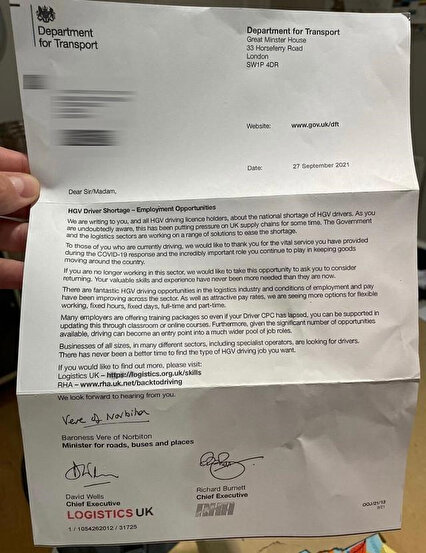 İngiliz The Independent gazetesinin haberine göre Ulaştırma Bakanlığı tarafından İngiltere'de yaşayan Almanlara gönderilen ve Ulaştırma Bakanı Barones Vere'nin imzasını taşıyan mektupta Almanlardan ağır vasıta şoförlüğü sektörüne “geri dönmeyi düşünmeleri” istendi.