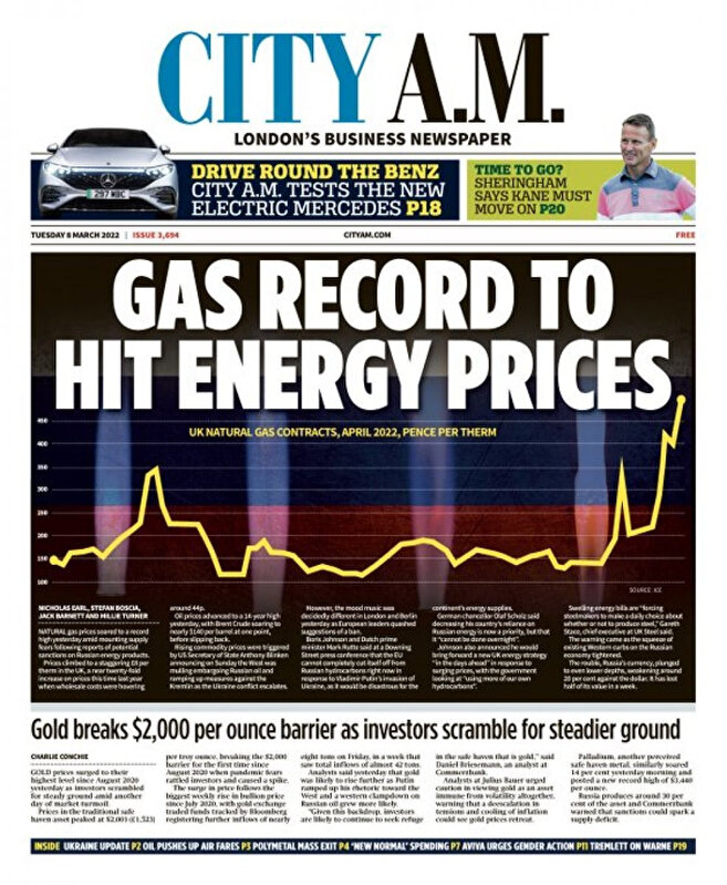 City gazetesi de petrol fiyatlarındaki sert yükselişi aktarırken, Avrupalı liderlerin Rus enerji kaynaklarına yönelik yaptırım fikrine karşı çıktığı kaydedildi. Brent petrol, dün varil başına 139 dolara yükseldi ve son 14 yılın en yüksek düzeyini gördü. Sonrasında 123 dolara kadar geriledi.