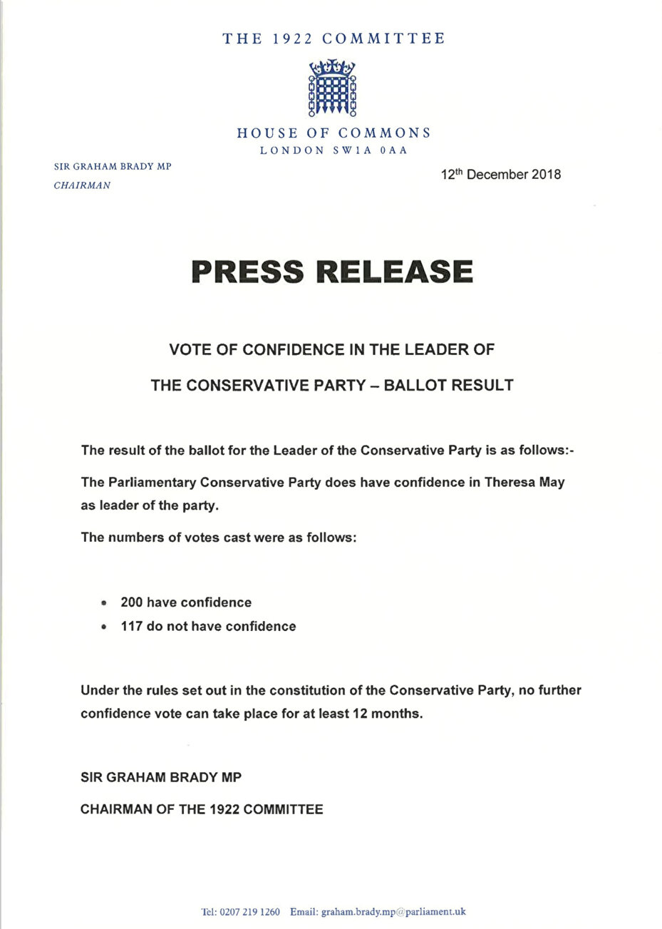 İngiltere Başbakanı Theresa May, parti içi güven oylamasını 117'ye karşı 200 oyla kazandı. May’in partisinden güven oyunu almasıyla 12 ay boyunca kendisi hakkında güvensizlik oyu istenemeyecek.