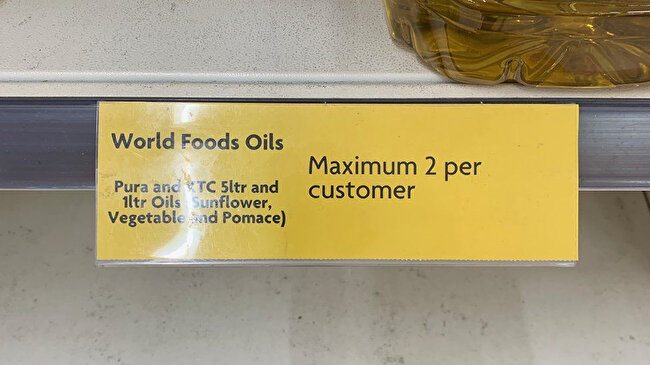 İngiltere'de bazı market zincirleri, yemeklik yağ satışına sınırlama getirdi. Sosyal medyada yayınlanan görüntülerde, market reyonlarında yağ satışına sınırlamaları gösteren ibareler görüldü.