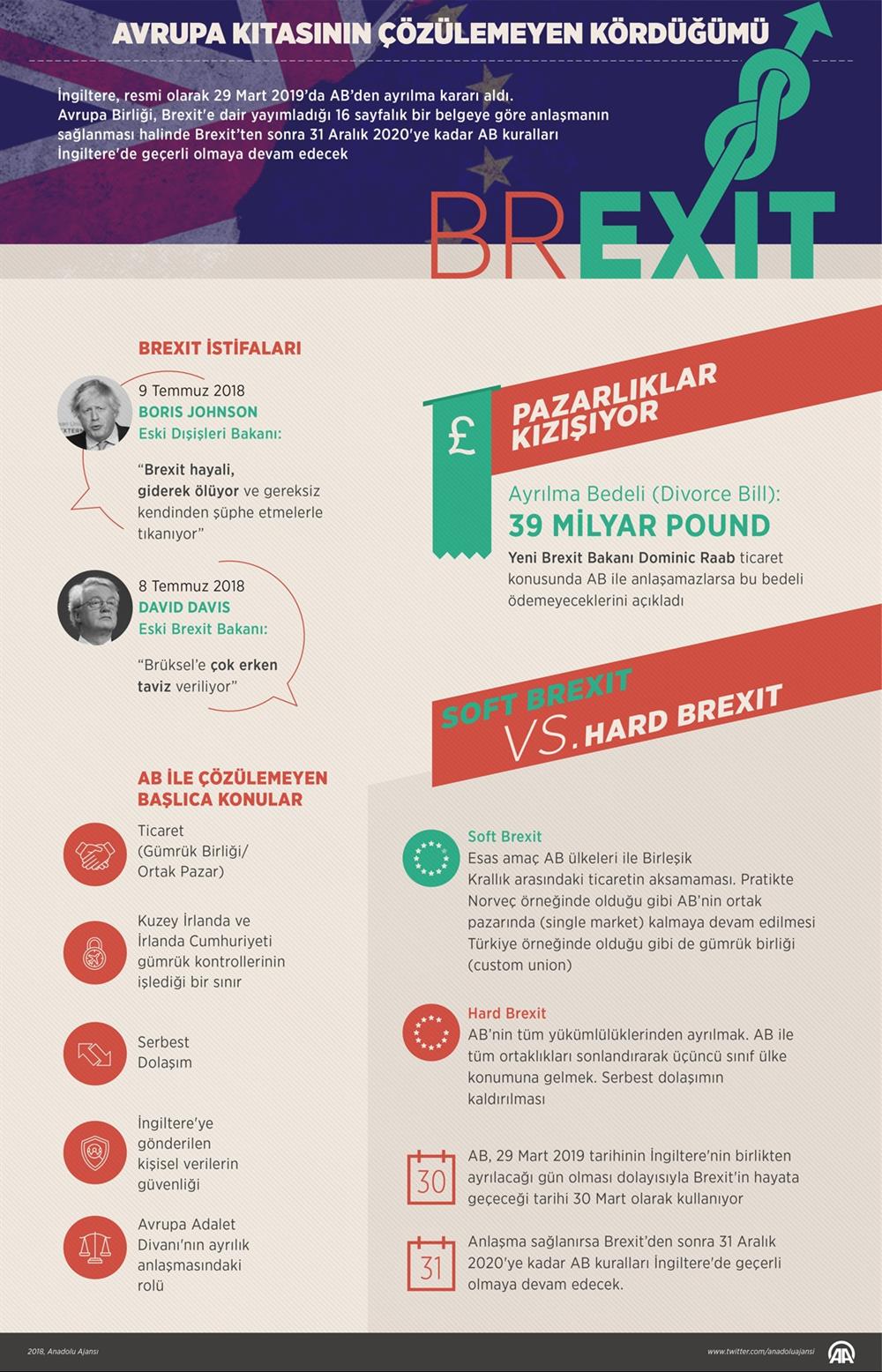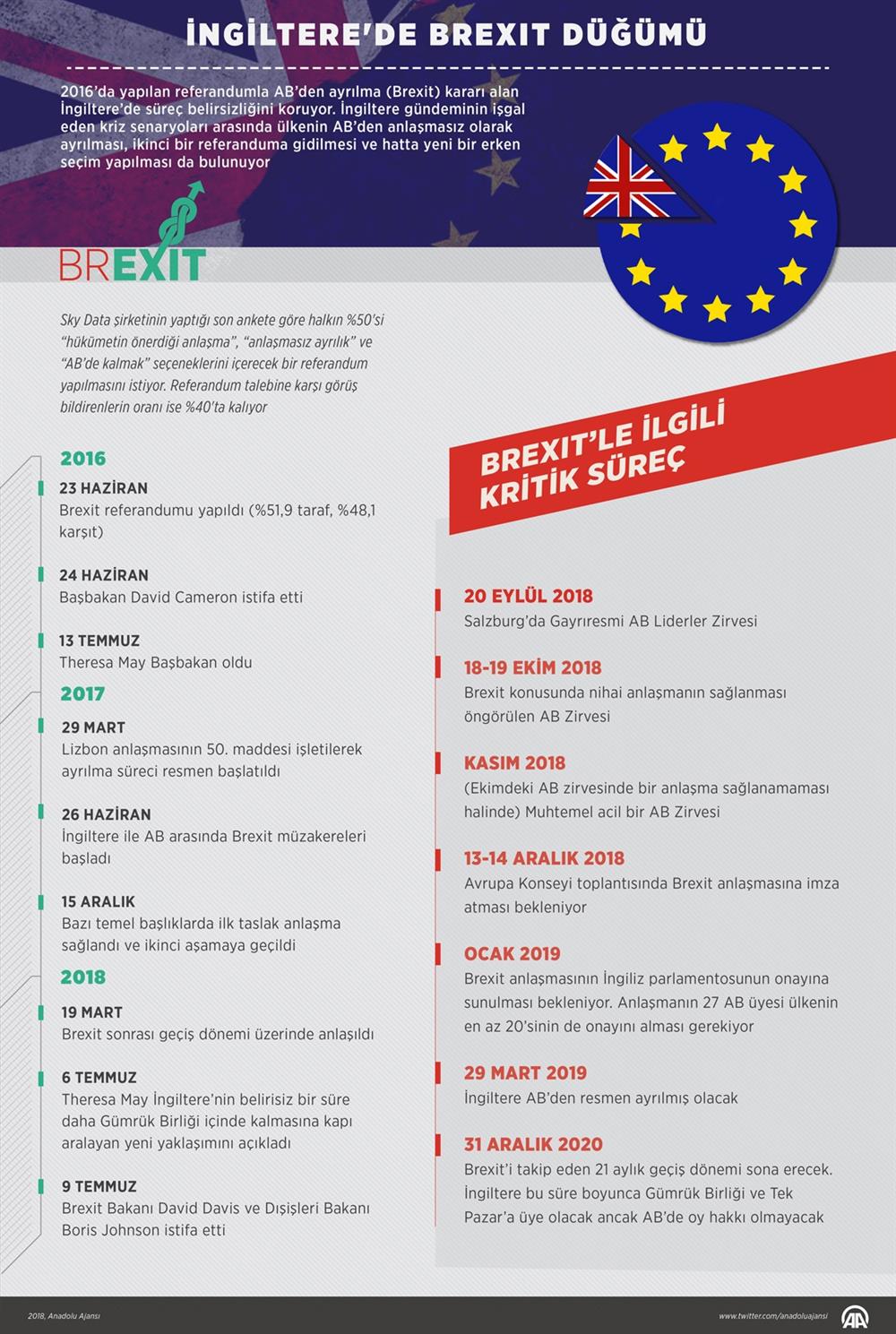 Önceki yıl yapılan referandumla Avrupa Birliği’nden ayrılma kararı alan İngiltere’de süreç belirsizliğini koruyor. Başbakan Theresa May'in açıkladığı yeni müzakere yaklaşımı kabinesinden önemli isimlerin istifasına yol açtı. Eski Dışişleri Bakanı Boris Johnson, May'in planını 'bombalı yeleğe' benzetirken, Londra Belediye Başkanı Sadık Han yeni bir referandum çağrısı yaptı. İngiltere'de, AB'den 'anlaşmasız ayrılıktan yeni bir erken seçime' kadar bir dizi kriz senaryosu gündemde.