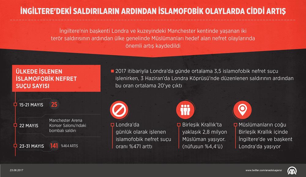 Müslümanlara yönelik saldırıları takip eden "Tell Mama" grubunun son verilere göre, 22 Mayıs'ta Manchester'da bir konserin bitiminde düzenlenen bombalı saldırının ardından 23-31 Mayıs haftasında islamofobik nefret suçları, önceki haftaya oranla yüzde 464 arttı.