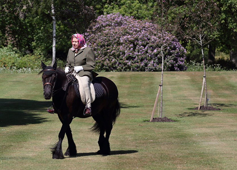 Safkan yarış atı yetiştiricisi olan ve atlara tutkuyla bağlı olna 94 yaşındaki Kraliçe Elizabeth, Windsor Kalesi’nin koronavirüs nedeniyle karantinaya alınmasından sonra ilk kez, renkli bir başörtü, tüvit ceket, binicilik pantolonu, beyaz eldiven ve bot giyip hafta sonu boyunca 14 yaşındaki Balmoral Fern adındaki Fell cinsi midilliye binerken görüntülendi.