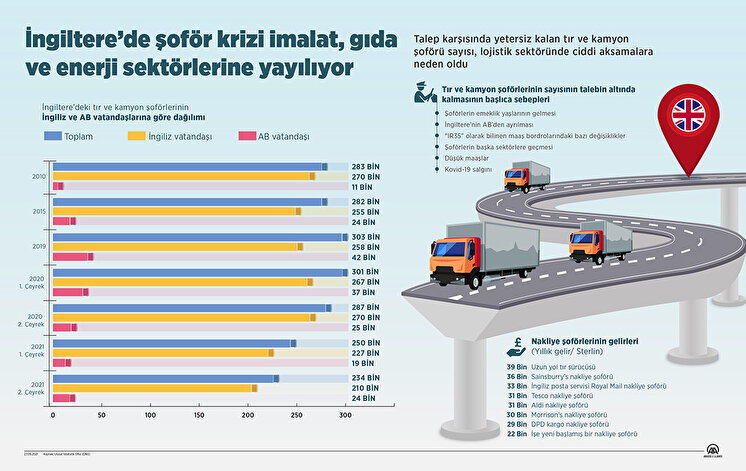 İngiliz Ulusal İstatistik Ofisi (ONS) verilerine göre, ülkede 2020 yılının ilk çeyreğinde 301 bin 497 olan tır ve kamyon şoförü sayısı, 2021 yılının ikinci çeyreği itibarıyla 232 bin 942'ye geriledi.