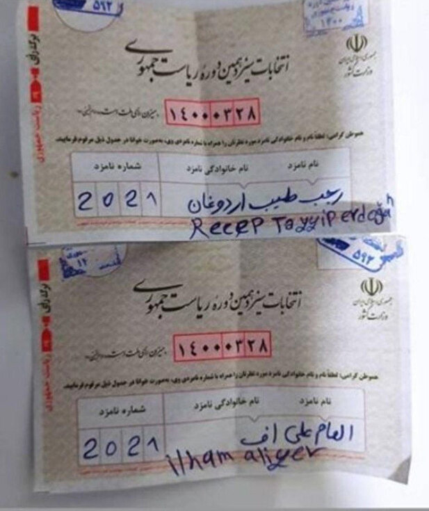 Boykot çağrılarının gölgesinde düzenlenen ve katılımın yüzde 48'de kaldığı İran'daki Cumhurbaşkanlığı seçimlerinde, Cumhurbaşkanı Recep Tayyip Erdoğan ve Azerbaycan Cumhurbaşkanı İlham Aliyev'e de oy verildi. Sandıktan 'Erdoğan' ve 'Aliyev' yazılı oy pusulası çıktı.