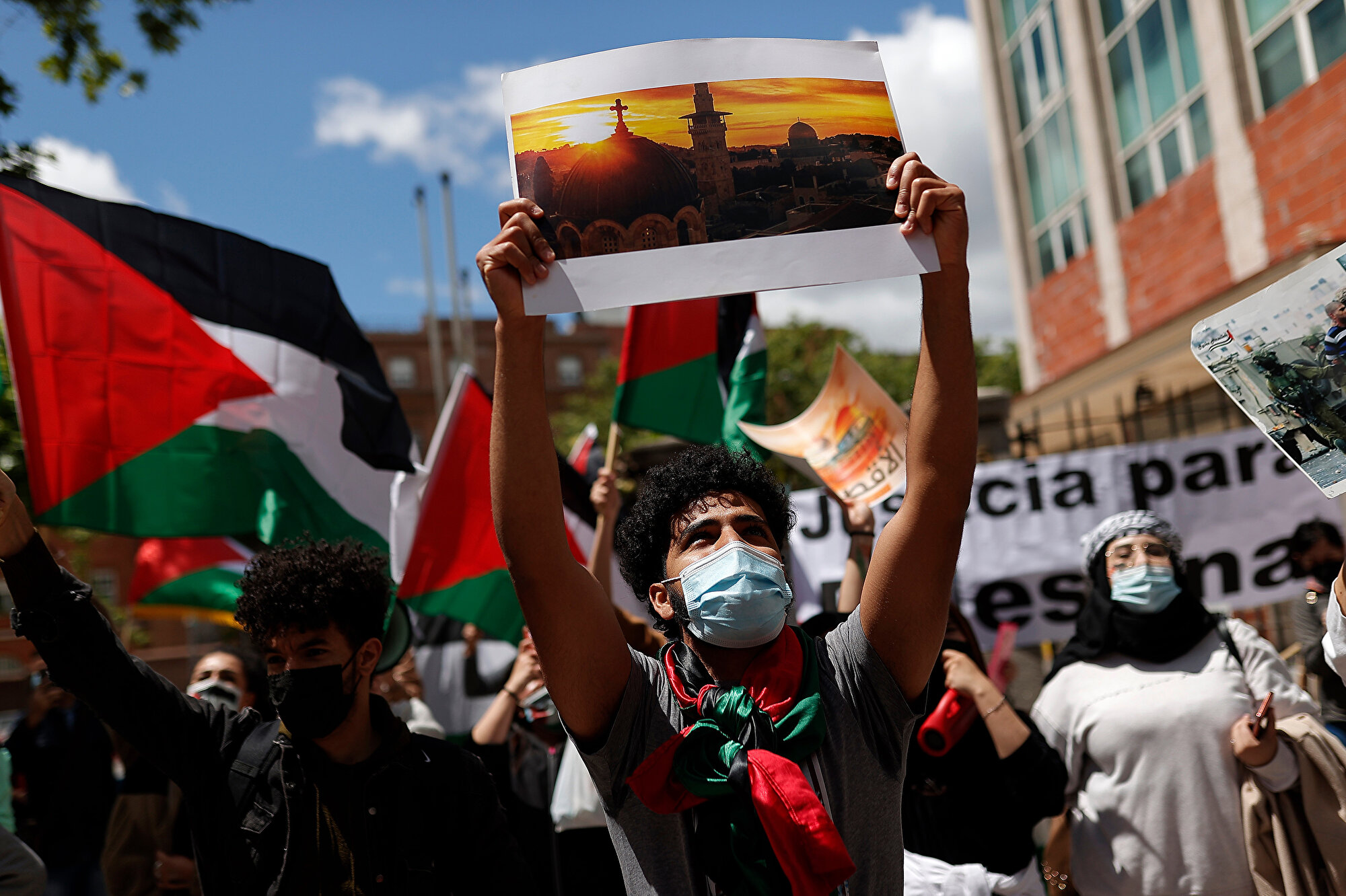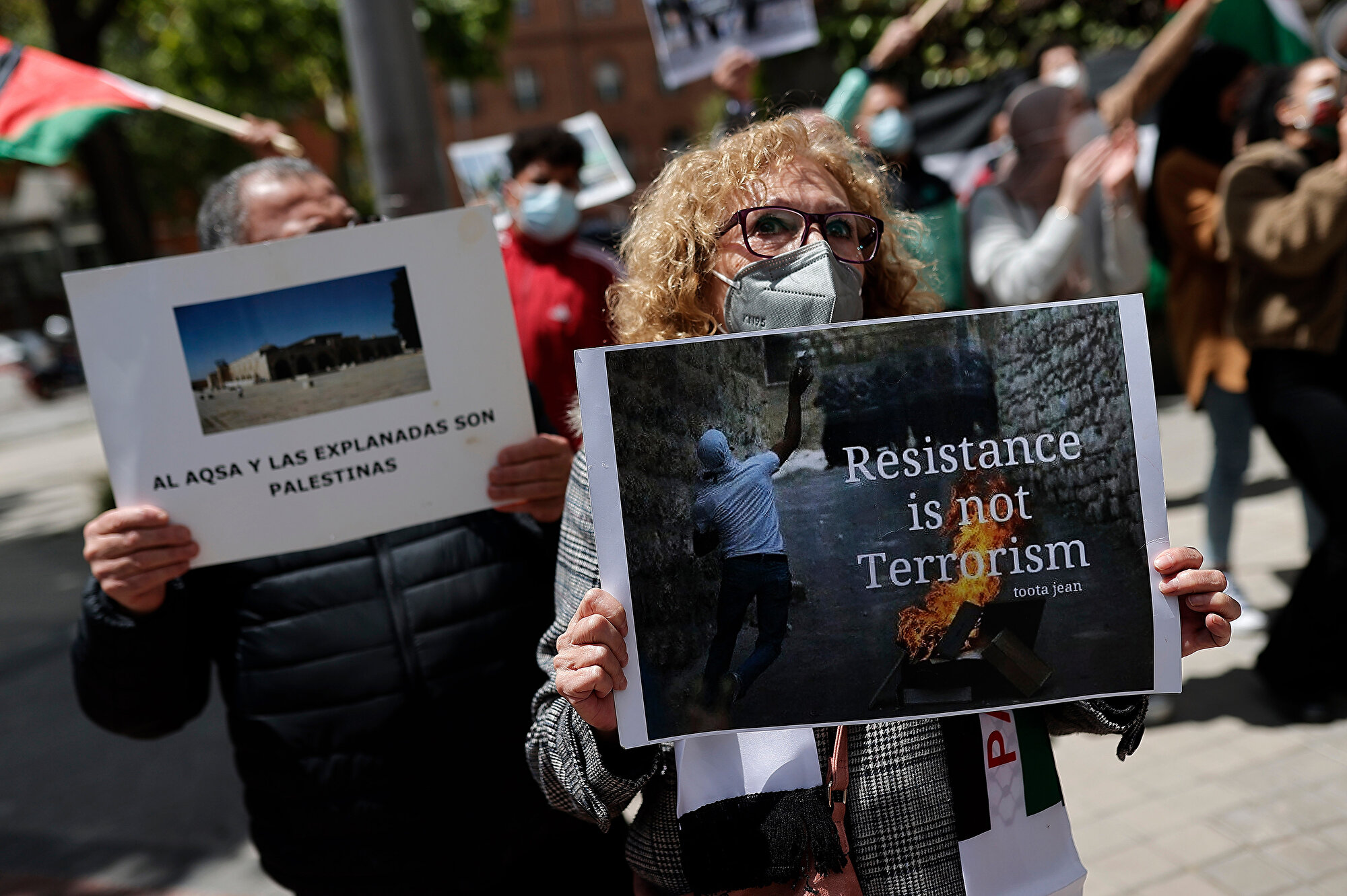 İspanya'nın başkenti Madrid'deki İsrail Büyükelçiliği binası önünde toplanan bir grup, İsrail'in Mescid-i Aksa ve Doğu Kudüs'te Filistinlilere yönelik saldırılarını protesto etti.