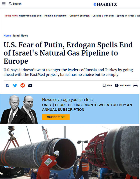 ABD, Türkiye’nin bypass edildiği EastMed doğalgaz boru hattı projesinden desteğini çekti. Projenin taraflarından İsrail’de, bu durum yenilgi olarak kabul edildi. Haaretz gazetesi, “İsrail'in boyun eğmekten başka seçeneği yok” yorumu yaptı. Cumhurbaşkanı Erdoğan’ın İsrail Cumhurbaşkanı Herzog’la görüşebileceklerini söylediği gün yayınlanan haberde, “ABD, Putin ve Erdoğan’ı kızdırmak istemiyor” denildi.
