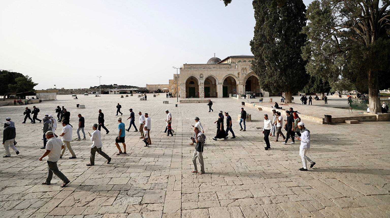 Fanatik Yahudi yerleşimciler, İsrail polisinin yoğun koruması eşliğinde Mescid-i Aksa'ya baskın düzenledi. Fanatik Yahudi yerleşimcilerin İsrail polisi eşliğinde Mescid-i Aksa'ya baskınına tepki gösteren Filistinliler, Kıble Mescidi'nde sloganlar atarak olayı protesto etti.