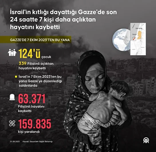 İsrail'in saldırıları ve ablukası nedeniyle kıtlık yaşanan Gazze Şeridi'nde son 24 saatte 7 kişi daha açlıktan yaşamını yitirdi. Gazze'deki Filistin Sağlık Bakanlığından yapılan yazılı açıklamada, açlıktan hayatını kaybedenlere ilişkin son bilgiler paylaşıldı. Açıklamada, son 24 saatte 7 Filistinlinin daha açlık ve yetersiz beslenme nedeniyle yaşamını yitirdiği belirtildi.