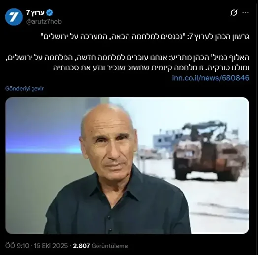 İsrailli Emekli General Gershon Hacohen, ülkesinin basınına yaptığı açıklamada, İsrail'in yeni bir savaşa gittiğini vurgulayıp, "Kudüs Savaşı’na doğru ilerliyoruz. Karşımızda Türkiye var." ifadelerini kullandı. "Bu, tehlikesi iyi anlaşılması gereken varoluşsal bir savaş." diyen Hacohen, "Türkler için Şam, aslında Kudüs’e giden bir basamak." dedi.