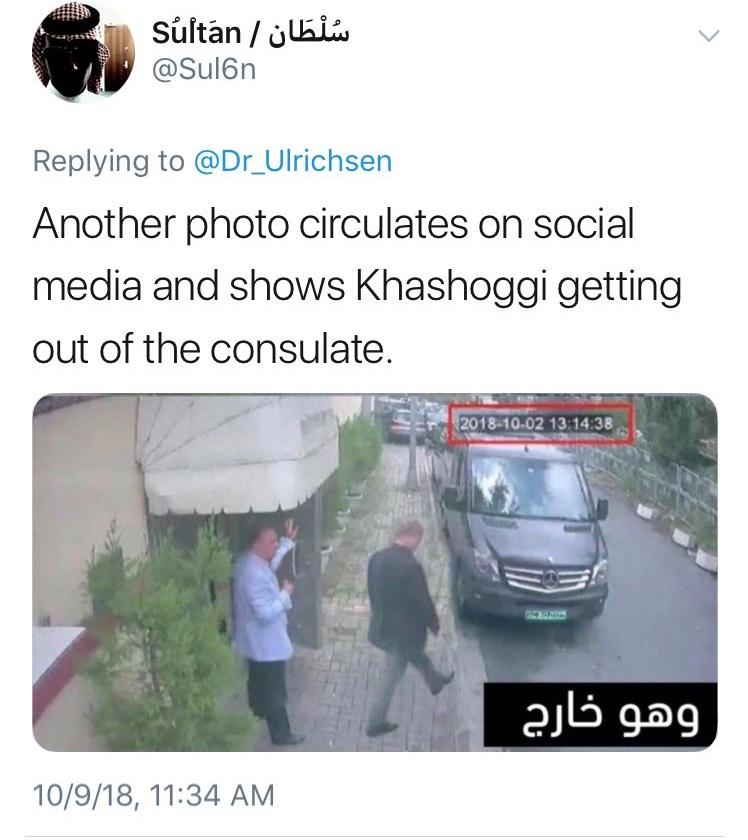 Cemal Kaşıkçı'nın Suudi Arabistan konsolosluğundan çıkış görüntülerini yayınlayamayan Suudi Arabistan, skandal oyunlara girişti. Suudi Arabistan tarafından desteklenen trol hesaplar, Kaşıkçı'nın konsolosluğa giriş anındaki görüntülerde oynama yaparak, kamuoyunu ikna etmeye çalıştı. Fotoğraf sosyal medyada alay konusu oldu.
