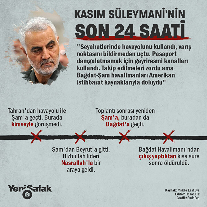 ABD ordusunun düzenlediği füze saldırısıyla hayatını kaybeden İran Devrim Muhafızları Kudüs Gücü Komutanı Kasım Süleymani'nin son 24 saatteki yolculuğunun Amerikan istihbaratınca yakından takip edildiği iddia edildi. Süleymani'nin Tahran'dan önce Şam'a gittiği ve buradan da Beyrut'ta geçerek Hizbullah lideri Hasan Nasrallah'la görüştüğü öne sürüldü. Görüşmenin ardından tekrar Şam Havalimanı'na geçen Süleymani, buradan son yolculuğu olan Bağdat Havalimanı'na indi ve kısa süre sonra füzelere hedef oldu.
