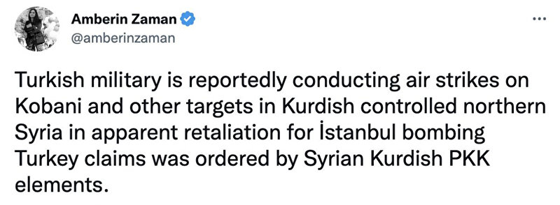 Operasyondan rahatsız olan terör destekçisi isimlerden de ardı ardına açıklamalar geliyor. Bunlardan biri de CHP Genel Başkanı Kemal Kılıçdaroğlu'nun İngiltere ziyareti sırasında görüştüğü hakkında yakalama kararı bulunan eski Taraf yazarı Amberin Zaman... PKK ve FETÖ sempatizanlığıyla bilinen Zaman Pençe-Kılıç Hava Harekatı'ndan duyduğu rahatsızlığı Twitter hesabından dile getirdi.