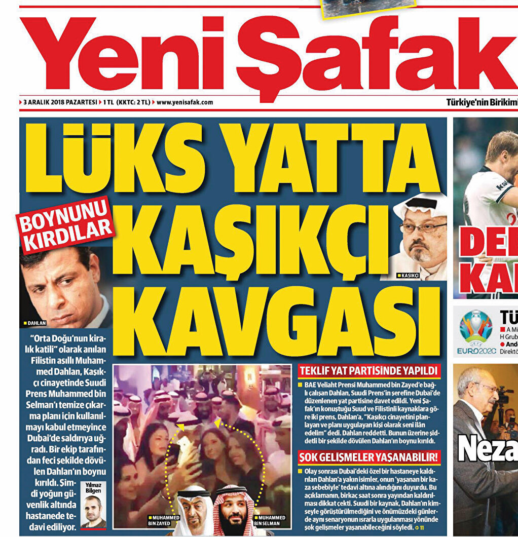 Ortadoğu'nun çıbanbaşı Birleşik Arap Emirlikleri Veliaht Prensi Muhammed bin Zayed'in tetikçisi Filistinli Muhammed Dahlan, kirli oyunlarını dünya gündemine taşıyan Yeni Şafak'ı hedef gösterdi. Yeni Şafak birkaç gün önce, Suudi Arabistan Veliaht Prensi Muhammed bin Selman ile BAE Veliaht Prensi Zayed'in, Cemal Kaşıkçı suikastini Muhammed bin Dahlan'a yıkmaya hazırlandığını birden fazla kaynağa dayanarak yazmıştı. Bu yüzden çıkan bir tartışmada da Dahlan'ın yaralandığı ve tedavi altında olduğunu bildirmişti.