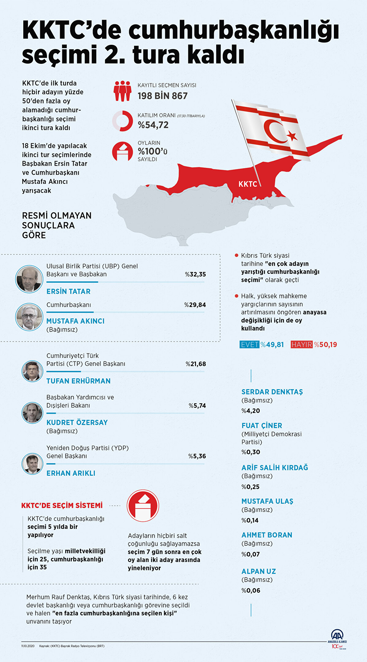 Kuzey Kıbrıs Türk Cumhuriyeti (KKTC) halkı, cumhurbaşkanı seçiminin ikinci turu için bugün sandık başına gidiyor. Başbakan ve UBP'nin adayı Ersin Tatar ile Cumhurbaşkanı ve bağımsız aday Mustafa Akıncı, seçimin ikinci turunda yarışacak- Siyasi partilerden CTP Akıncı'ya, DP ve YDP ise Tatar'a desteğini açıklarken, HP seçmenini yönlendirmedi. Oy verme işlemi sabah 08.00'da başlayacak ve 18.00'da bitecek. Seçmenler, Kovid-19 tedbirleri çerçevesinde oylarını maske ve eldivenle kullanacak