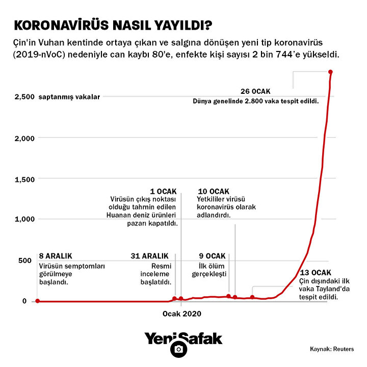 Çin'de 106 kişinin ölümüne, 2 bin 800 kişinin hastalanmasına neden olan ve şu ana kadar 15 ülkede tespit edilen Koronavirüs dünyaya Huanan deniz ürünleri pazarından yayıldı. Çin'deki ilk vakalar pazarda çalışan ve buradan alışveriş yapan kişilerde tespit edildi. 1 Ocak'ta kapatılan pazarda misk kedisi, yarasa, kurt, tilki, yılan, sıçan, ve semender gibi hayvanların da aralarında bulunduğu 112 tür hayvan eti satılıyor. Çinli uzmanlar pazardan topladıkları 568 örneğin 32'sinde virüs tespit etti.