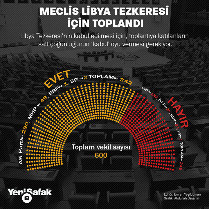 TBMM, Libya'ya asker gönderilmesine ilişkin Cumhurbaşkanlığı tezkeresinin görüşmeleri için olağanüstü toplanmış yapılan oylamada tezkere 325 evet oyuyla kabul edilmişti.
