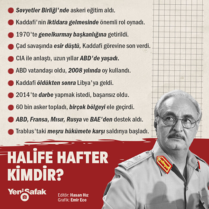- Trablus'a yönelik saldırıların savaş uçakları ve insansız hava araçları ile yapıldığını belirten saha kaynakları, "Bu saldırıların arkasında aslında Hafter kuvvetleri yok.Rusya, Mısır ve Sudanlı güçlersavaşıyor. Bu birlikler,lazer güdümlü füzeler, savaş helikopterleri ve MIG23 ve Sukhoi savaş uçaklarıile destekleniyorlar" ifadelerini kullandı.