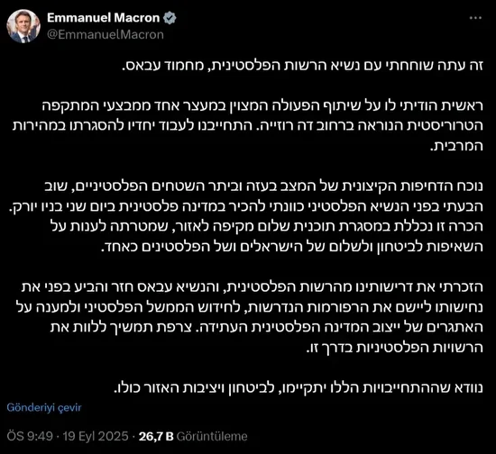 Fransa Cumhurbaşkanı Emmanuel Macron, Filistin Devlet Başkanı Mahmud Abbas ile yaptığı görüşmeye ilişkin sosyal medya hesabından bilgilendirme paylaşımı yaptı. İngilizce, Arapça ve İbranice paylaşım yapan Macron, "Pazartesi günü Filistin Devleti'ni tanıma niyetimi bir kez daha ifade ettim." dedi.