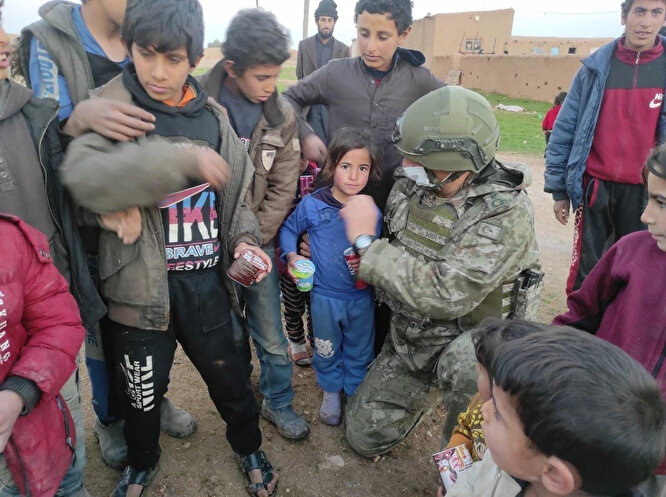 Mehmetçik, Barış Pınarı bölgesinde bulunan Suriye'nin Nustel mahallesindeki çocuklara gıda yardımı yaptı.