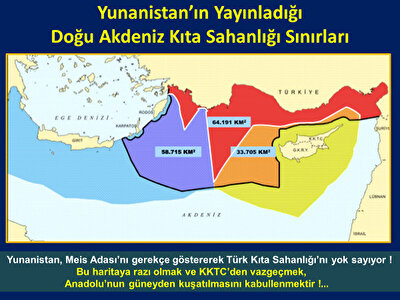 - Akdeniz’de çizdikleri kıta sahanlığı haritalarına göre Yunanistan'ın deniz yetki alanı 58 bin 715 km2. Sayının absürtlüğünü şöyle anlatabiliriz: Türkiye’ye Akdeniz’de bıraktıkları alanın toplamı 61 bin km2