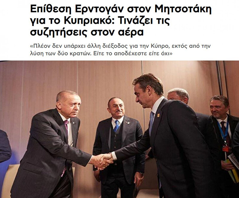 Yunan medyası, Cumhurbaşkanı Erdoğan'ın Miçotakis'e karşı atağa geçtiği belirtilerek, Kıbrıs meselesine ilişkin Erdoğan'ın,