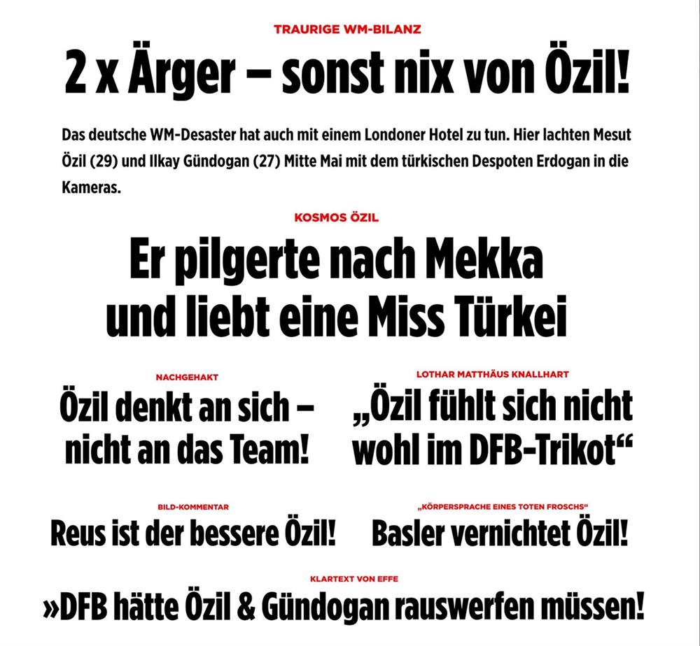 gazetesi daha önce Özil hakkında "Umre'ye gitti, Türkiye'yi özlediğini söyledi" ve "Alman Milli Takımı Özil ve Gündoğan'ı kovmalıydı" şeklinde manşetler atmıştı.
