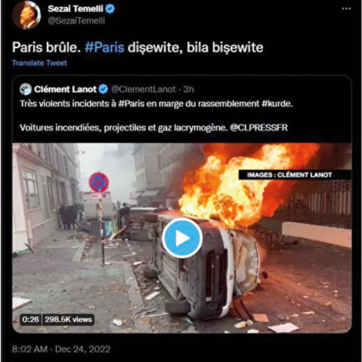 - Cumhurbaşkanlığı Sözcüsü İbrahim Kalın, paylaştığı Twitter mesajında Fransa’daki olaylara tepki gösterdi. Kalın, PKK’lı teröristlerin Paris sokaklarını ateşe verdiğini belirtip “Hala sessiz kalacak mısınız?” dedi. Kalın, “Bu Fransa’daki PKK. Suriye’de desteklediğiniz terörist organizasyonla aynı. Aynı PKK son 40 yılda binlerce Türk’ü, Kürt’ü ve güvenlik görevlisini katletti. Onlar şimdi Paris sokaklarını ateşe veriyor. Hala sessiz kalacak mısınız?” ifadelerini kullandı.