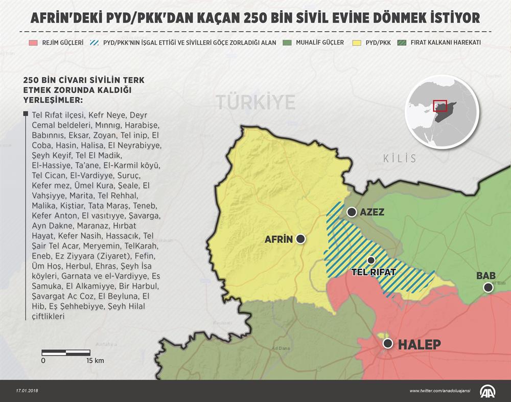 Türkiye, Fırat Kalkanı Harekatı'yla terör örgütü DEAŞ'ı sınırından uzaklaştırıp, PYD/PKK'nın işgalini sınır hattı boyuna yaymasının önüne geçtikten sonra hedefin Afrin olduğunu açıklamıştı.