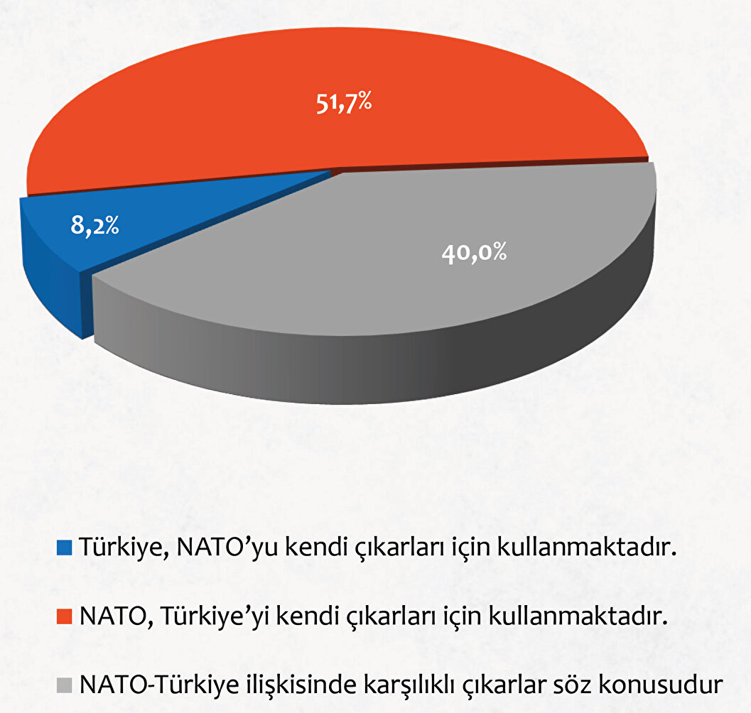 - Araştırmada, “Sizce NATO hangisidir” şeklinde yöneltilen soruya vatandaşların yüzde 82.4’ü“ABD çıkarlarını savunan bir yapı”cevabı verdi. NATO’nun tüm üyelerin çıkarlarını savunan bir yapı olduğunu düşünen vatandaşların oranı ise yüzde 17.6.