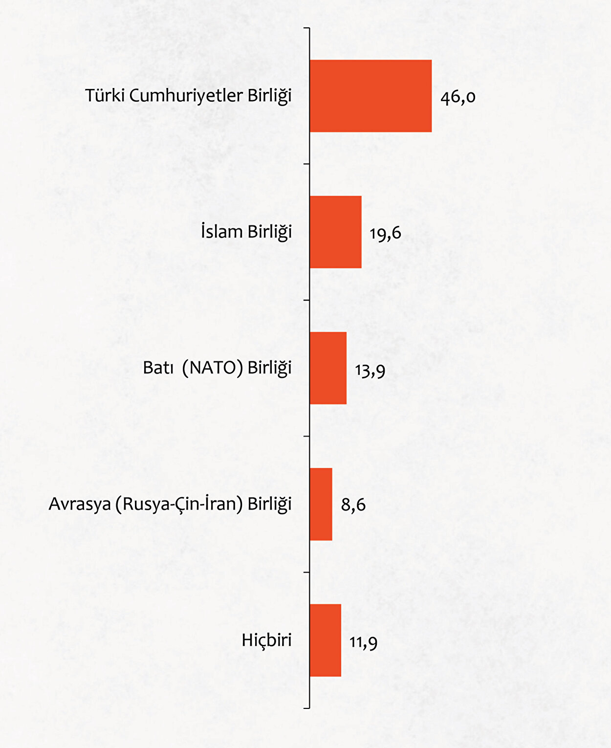 - Araştırmada yer alan “Türkiye için aşağıdakilerden hangisi daha iyidir” sorusuna katılımcıların yüzde 46’sı Türki Cumhuriyetler Birliği cevabı verdi. Aynı soruya verilen diğer yanıtlar şöyle:“İslam Birliği yüzde 19.6, Batı (NATO) Birliği yüzde 13.9, Avrasya (Rusya- Çin- İran) Birliği yüzde 8.6, hiçbiri yüzde 11.9”