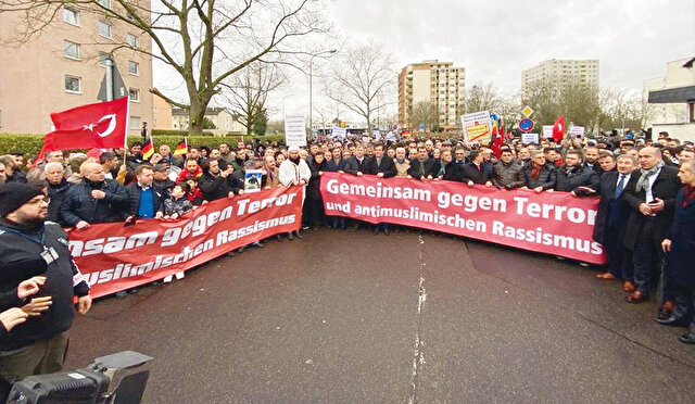 Hanau’da ırkçı terör saldırısını protesto etmek için düzenlenen geniş katılımlı gösteriye birçok Türk derneği ve cami teşkilatı katıldı. Mitinge katılanlar ellerinde “Hep birlikte teröre ve Müslümanlara yönelik ırkçılığa karşı” pankartları taşıdı. Miting alanına yürüyüşte dev Türk bayrağı açan katılımcılar, “Kahrolsun AfD, Naziler dışarı” sloganları da attı