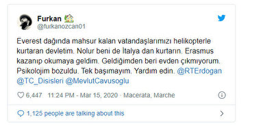 ERASMUS programları kapsamında İtalya’da eğitim gören Furkan Özcan attığı tweet ile hem Türkiye'nin vatandaşları için neler yaptığını gösterdi, hem de İtalya'daki durumu gözler önüne serdi. "Everest dağında mahsur kalan vatandaşlarımızı helikopterle kurtaran devletim. Ne olur beni de İtalya dan kurtarın" diye sosyal medyadan çağrı yapan Özcan, bu akşam uçakla Türkiye’ye getirildi.