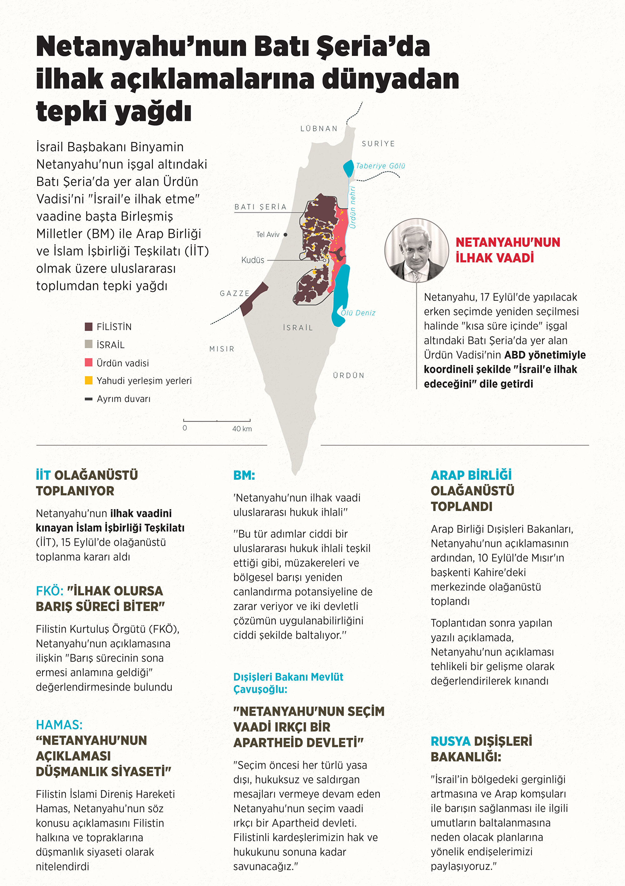 Netanyahu, 17 Eylül'de yapılacak erken seçim öncesi düzenlediği basın toplantısında, yeniden seçilmesi halinde "kısa süre içinde" Batı Şeria'da yer alan Ürdün Vadisi'nin ABD yönetimiyle koordineli şekilde "İsrail'e ilhak edeceğini" dile getirmişti.