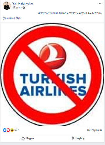 Netanyahu'nun oğlu Yair Netanyahu küstah bir boykot çağrısında bulundu. Netanyahu Barış Pınarı Harekatı'na karşı Türk Hava Yolları'nın boykot edilmesini istedi.
