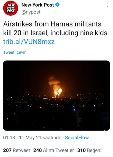 New York Post gazetesi çirkin bir manipülasyona imza attı. İşgalci İsrail'in 9'u çocuk 20 Filistinliyi katletmesi haberini, 'Hamas kuvvetlerinin hava saldırıları sonucu 9'u çocuk olmak üzere 20 İsrailli öldü' şeklinde paylaştı. Haber tepkilere neden olurken gazete sosyal medya hesabından paylaşımı silmek zorunda kaldı.